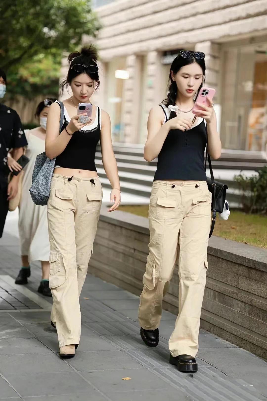 用修身的黑色吊帶小背心,搭配相對寬鬆的卡其色工裝風闊腿褲。簡簡單單的穿衣組合,也非常的時髦性感。像這種修身的黑色小背心,配同色系黑色厚底鞋,更大方顯高。