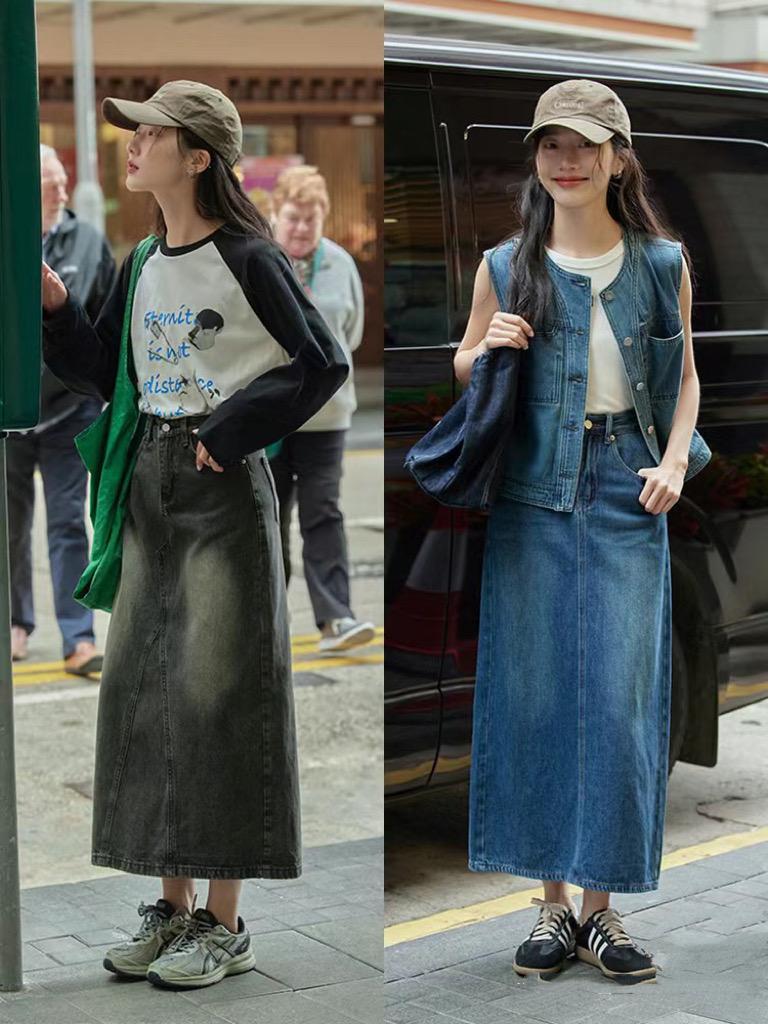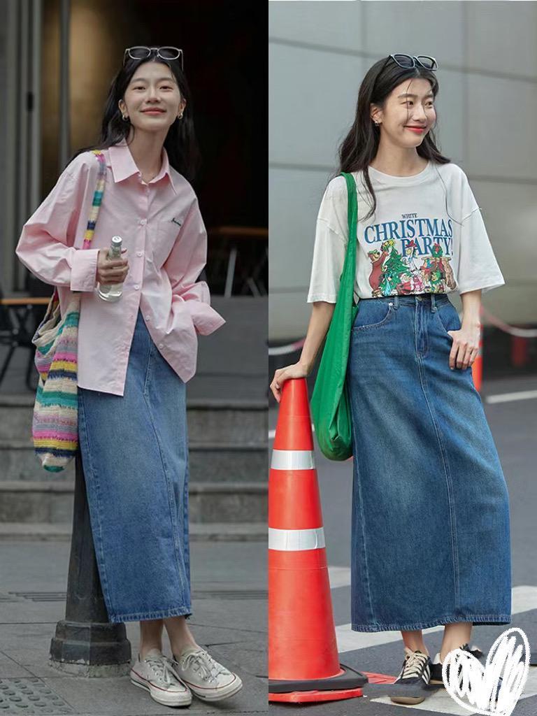 其實高腰的牛仔半身裙,對於身材的修飾性極強。小個子、梨形身材、腿粗、下半身厚重的人羣,都可以選擇這樣的組合。一半輕盈、一半內斂,更彌補了氣質上的不足。