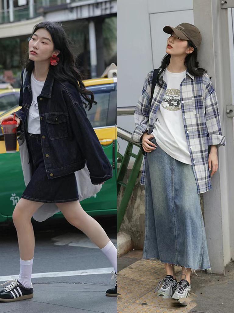 像這種寬鬆的字母印花T恤,疊搭寬鬆的格子襯衫,文藝又慵懶。配一條高腰的牛仔半身裙,可以讓簡簡單單的穿搭變得時尚出彩。牛仔半身裙的搭配、也會更加復古慵懶。
