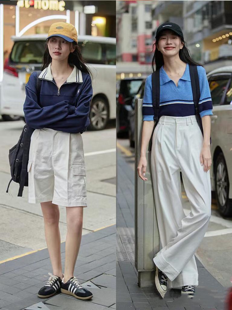 這裏的搭配,也可以秉承着時尚互補的選擇。比如用短袖的polo衫搭配高腰的西裝闊腿褲,用長袖的polo衫來搭配高腰的西裝短褲,清爽、帥氣、利落又大方。