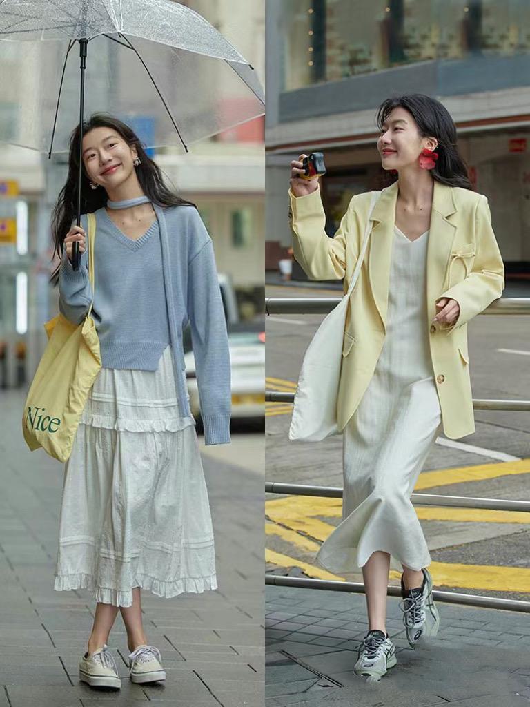 春末夏初,溫度適宜。選擇裙裝的時候,不要搭配太短的款式。如果裙子的下襬太短,必然需要疊搭中筒襪、或者連褲襪,增加駕馭難度。