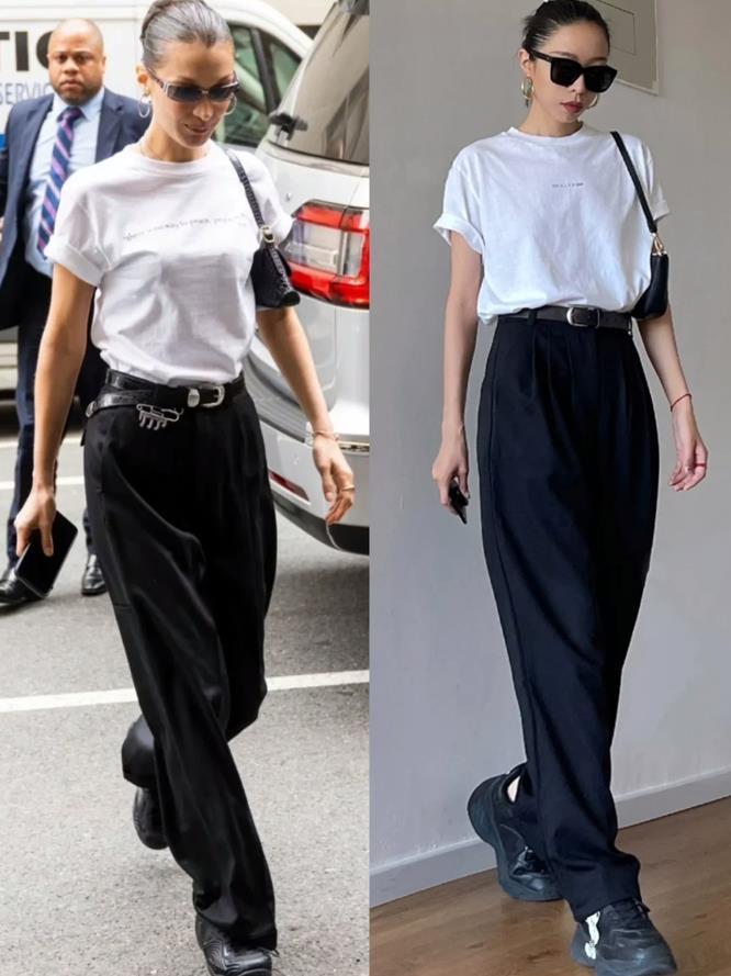 在選擇與襯衫相配,顏色建議選擇素雅一點的款,t恤也是,因爲中性風穿搭,配色是比較簡潔的,越是簡單越高級。