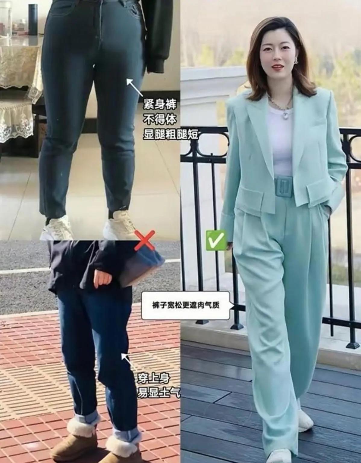 對於上了年紀的女人來講,緊身褲必然是不夠體面的。而且太緊身的褲型,還容易暴露體型的不足。比如顯腿粗、顯腿短、上身顯土氣等等,所以不建議大家總穿小腳褲。