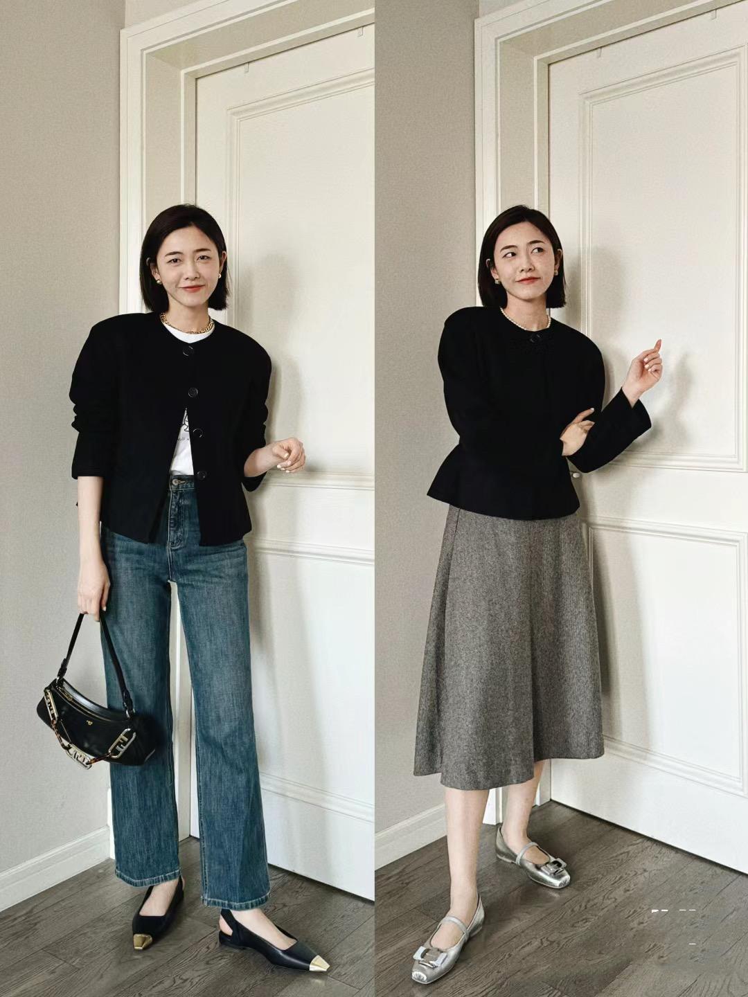 寬鬆的小香風外套,配一條修身的直筒牛仔褲,可以顯得雙腿筆直挺拔。想要更浪漫溫柔一些,也可以搭配緞面半身裙。相對而言還是直筒牛仔褲的搭配,更加體面利落。