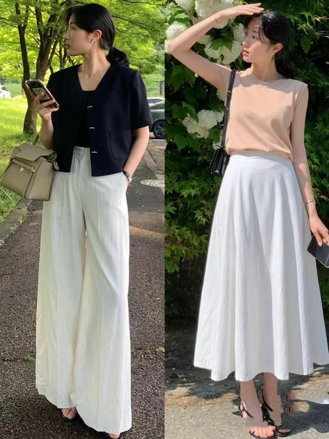 一件裸粉色的砍袖上衣,直接搭配高腰的白色半身裙,溫婉大方的美自然流露。像這種白色半身裙,選擇了大波浪的裙襬,給人一種更溫柔大氣的美,也顯得雙腿纖細。