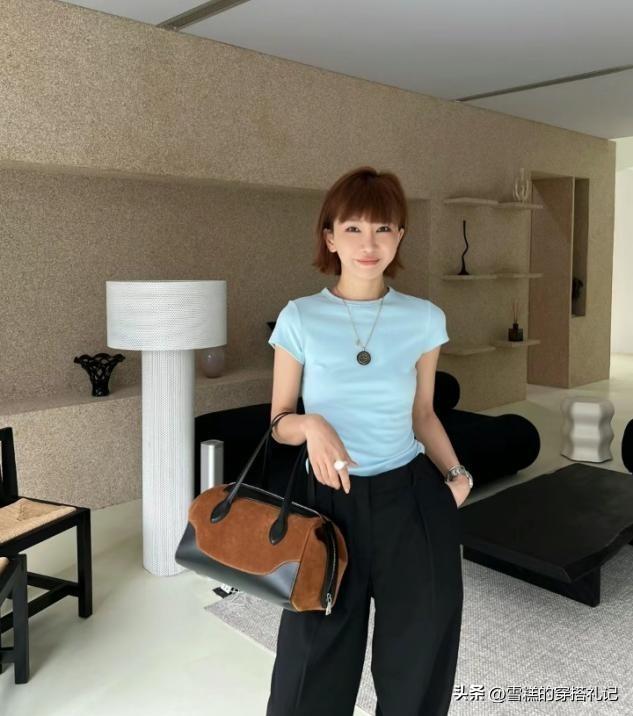 清新而又漂亮的淺藍色,絕對是很適合那些穿在上半身衣物的配色,比如一件真絲款式的緊身上衣或者內襯,因爲穿出了得體的修身線條,所以顏色不能太過於厚重,否則和大輪廓的褲裝就沒有辦法相互平衡了。