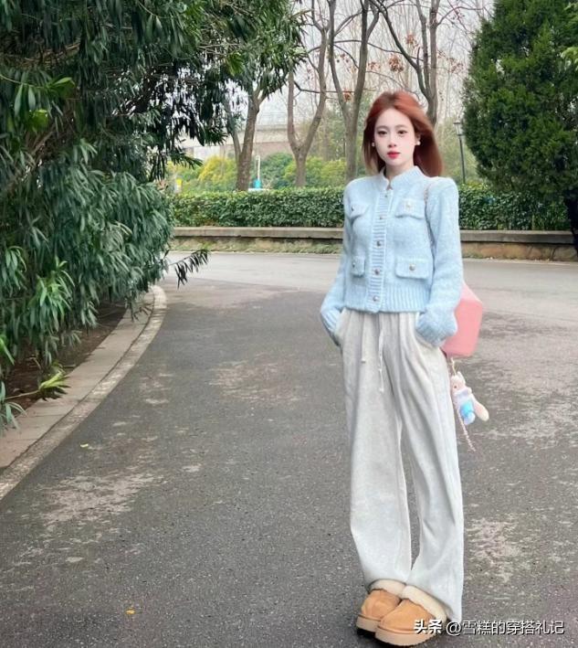 藍色搭配白色是很有技巧的,說同樣是屬於清爽的簡單配色,但是儘可能讓藍色穿在上半身,偏短款的小香風外套或者是西裝,展現出休閒簡約日常穿搭的一面,純白色的休閒長褲,維護了線條的延展性,而且氣質也非常簡約大氣。