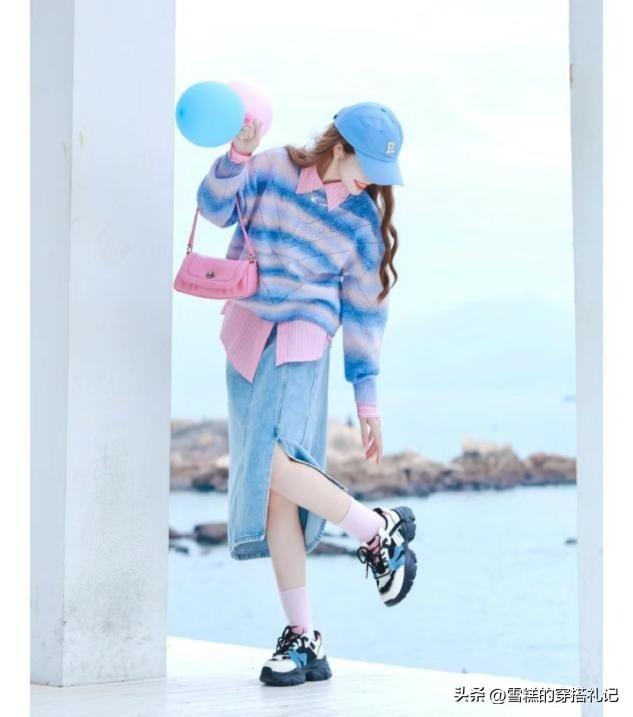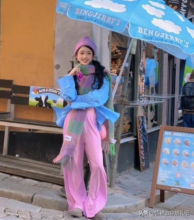 藍色與粉色的配色也是經典好看的選擇,這兩種顏色無關乎主次地位,就算是五五平方,也可以穿出造型減齡可愛的一面,但是服裝的款型一定要偏大,緊身款式的造型會顯得比較小氣。