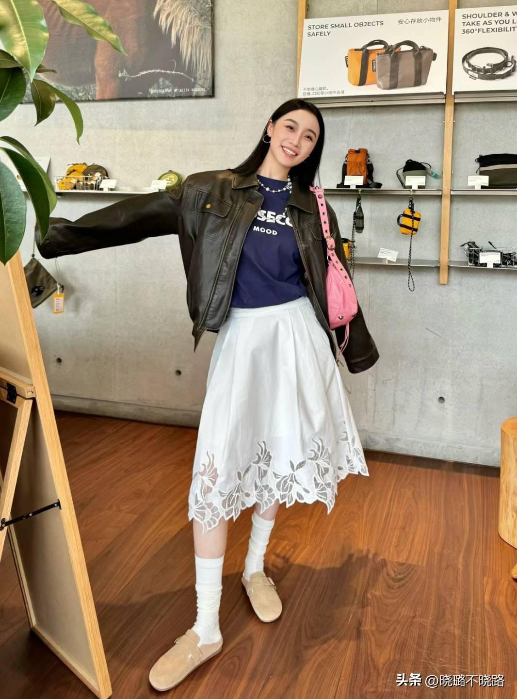 春季穿搭離不開輕盈感的塑造,而這種感覺則需要淺色系去完成,比如白色的鏤空半身裙,搭配白色堆堆襪和卡其色勃肯鞋,就能讓下半身看上去特別清爽乾淨。