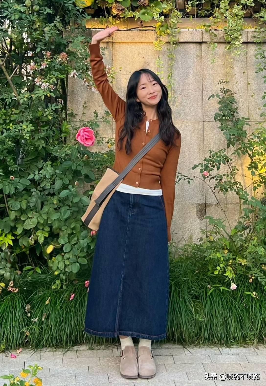 ★搭配方案:牛仔裙+針織馬甲+橙色包包+勃肯鞋
