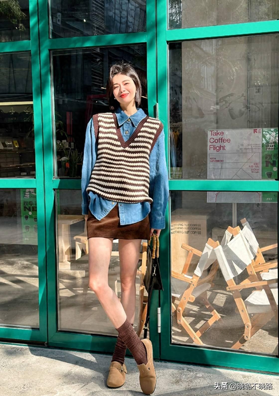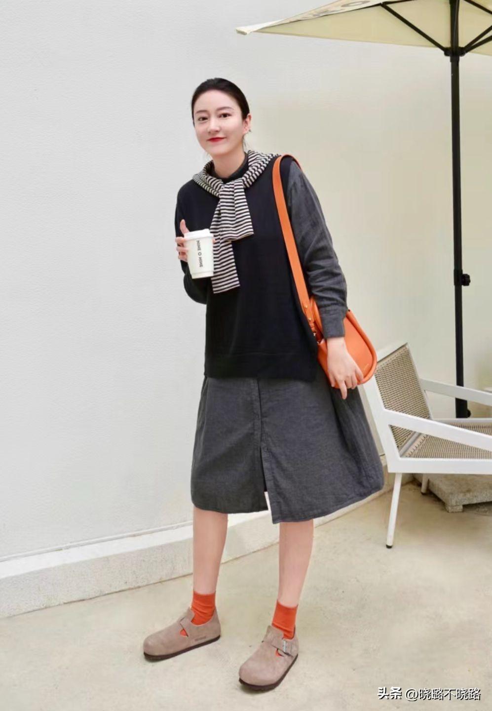 比如橙色的短襪和單肩包,就能夠讓人眼前一亮。深灰色的及膝牛仔裙,疊穿一款黑色針織馬甲和條紋披肩,層次感十足;勃肯鞋則可以選擇比較經典的卡其色,百搭又不失高級感。