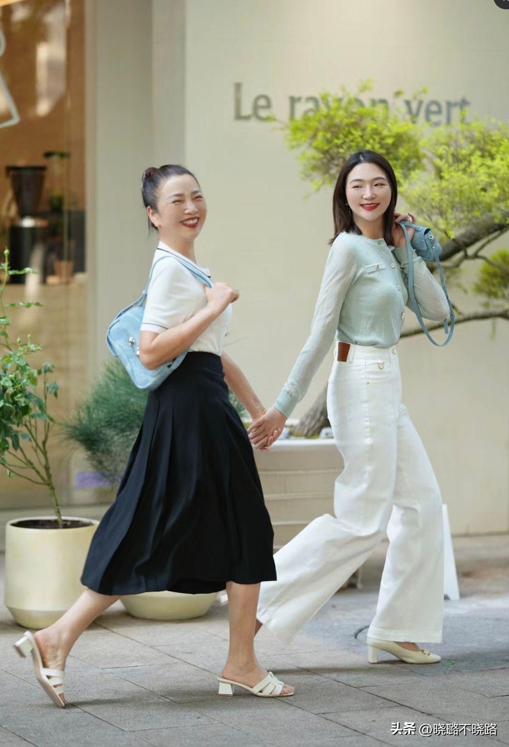 杭州阿姨們的搭配都是屬於偏長款的裙裝設計,所以它本身標準比例的襯托已經被直觀地展現出來了,那麼在這個時候就建議大家選擇的低跟鞋與長裙最好是能夠是同色系的搭配,縱向來看的話呼應感很明顯,而且縱向拉伸拉長的效果是非常強烈的。