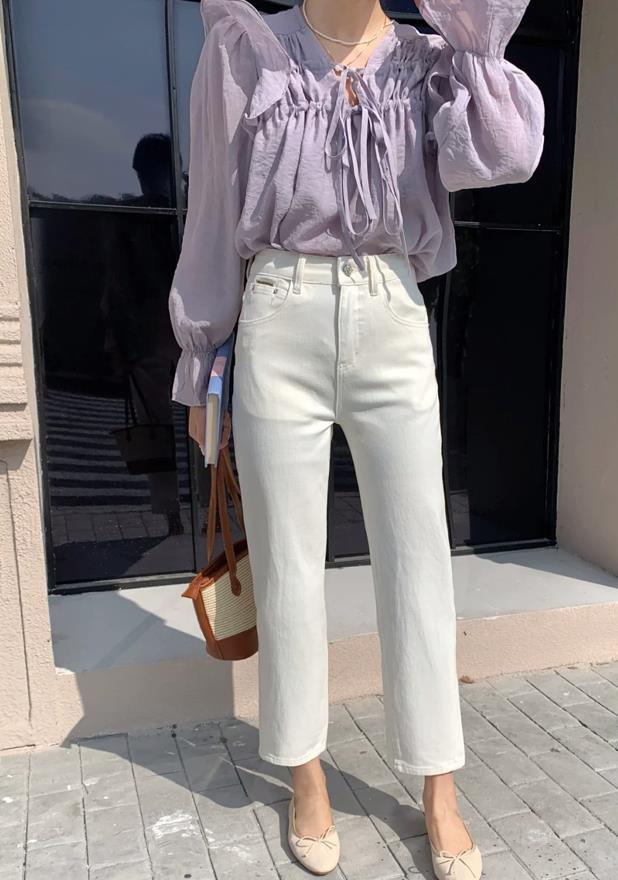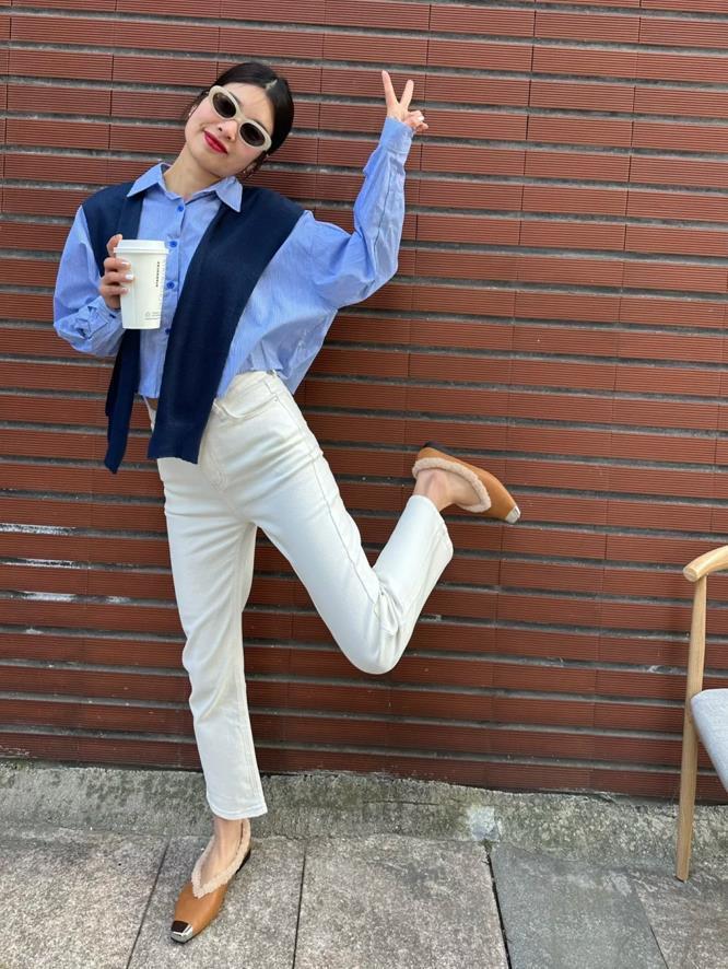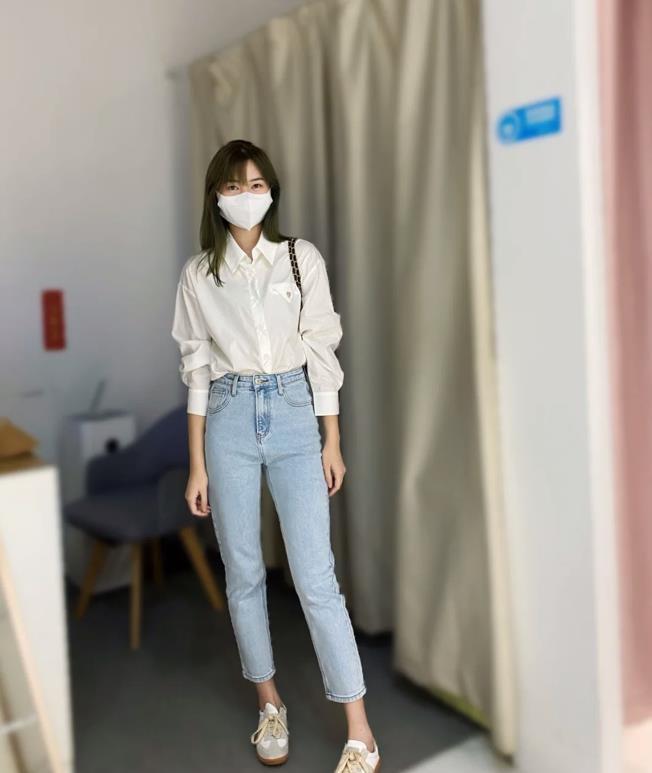 乾淨的白色牛仔煙管褲,一點都不會顯胖,反而把雙腿比例修飾得又長又筆直。