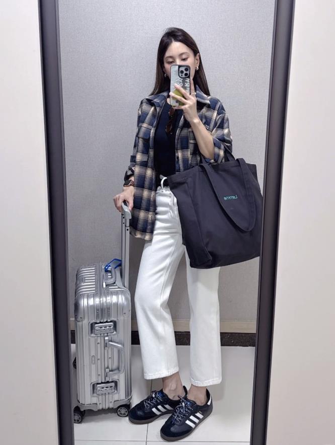 格子襯衫+白色牛仔煙管褲,一簡一繁的組合,看起來就十分顯層次,顏色比較深的襯衫,直接當防曬衫穿,裏面配件背心或短袖t恤就很ok。