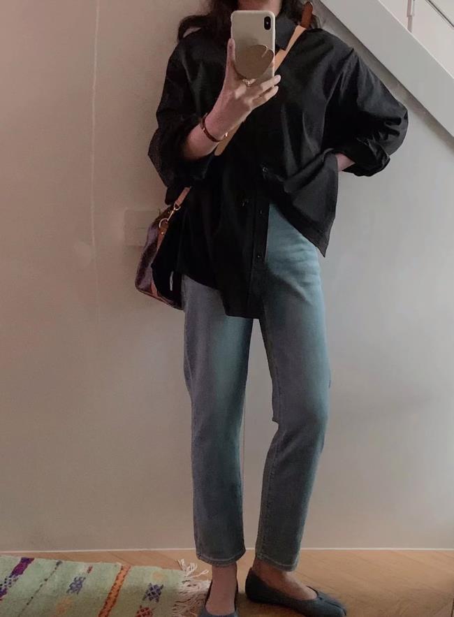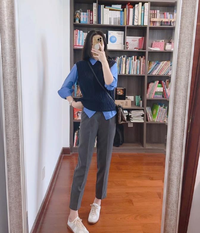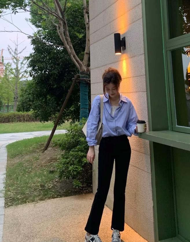 在職場上班的姐妹,如果要選擇襯衫+煙管褲這一組穿搭,那麼建議選擇深色或者是藍色的襯衫,搭配黑色西裝煙管褲,就可以打造出幹練專業的形象。鞋子的選擇,配樂福鞋、皮鞋都行。