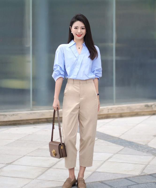 很適合職場上班的一套穿搭,春夏季節都可以這麼穿,藍色中袖襯衫,這個低飽和度的藍色,也太襯膚色了,很顯白。搭配淺卡其西裝煙管褲,不僅顯氣質,還不失時髦感。