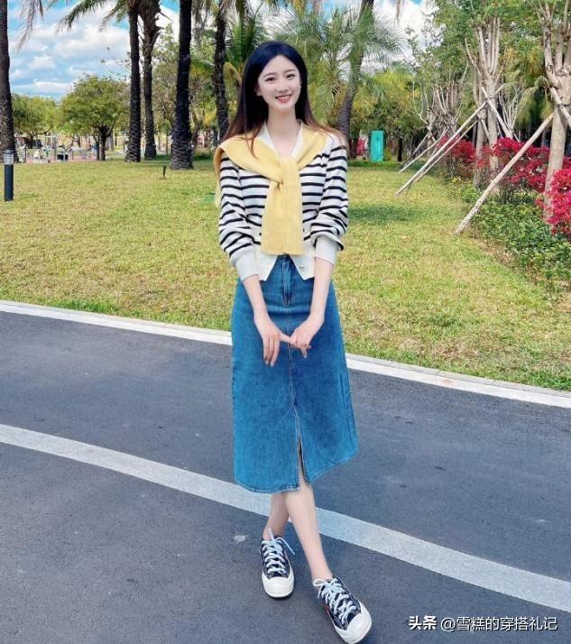 如果說你追求的是比較精簡乾淨的着裝視覺效果,那麼裙子的曲線也可以比較利落,利用直筒款型的半身裙來展示縱向曲線,向下延展的效果,牛仔裙成爲了優選,能夠修飾身材的凹凸比例,短款奶奶衫也能穿出彩。