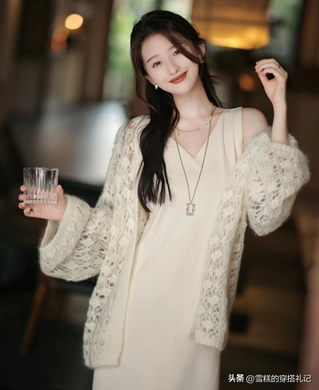 奶奶衫的設計並不一定全都是密針腳,相比於圖中這種鏤空的款式,我們可以穿出一種開衫的設計感,這一類的奶奶衫就很有溫柔的氣質,主打的是一種法式氛圍的穿搭風格,用來搭配連衣裙真的太好看了。