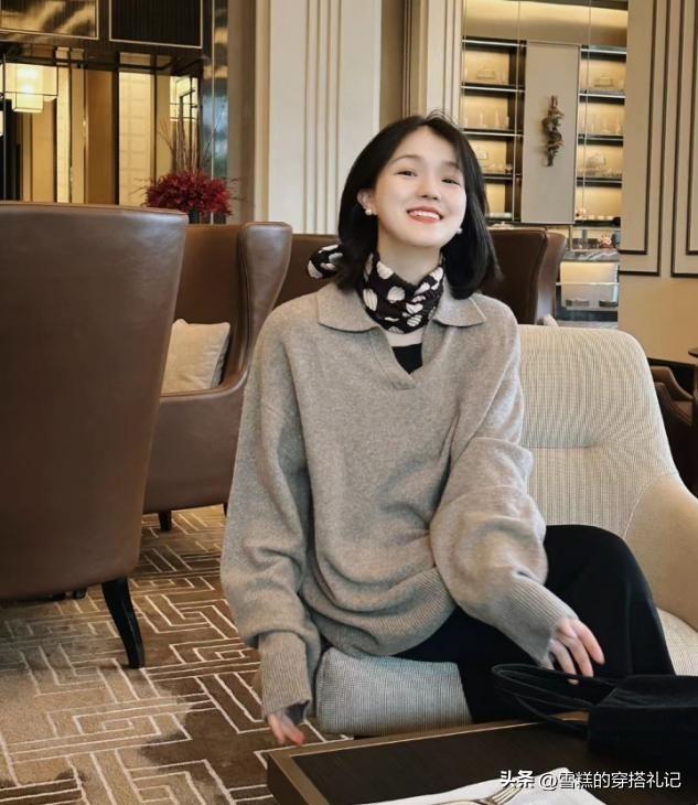 大領口款式的針織上衣更有看點,因爲抓住了領口部分的清爽性,如果我們選擇利用絲巾來作爲修飾的話,領口部分大面積的空白感就有了位置來放置,不會顯示出視覺上的單調性。