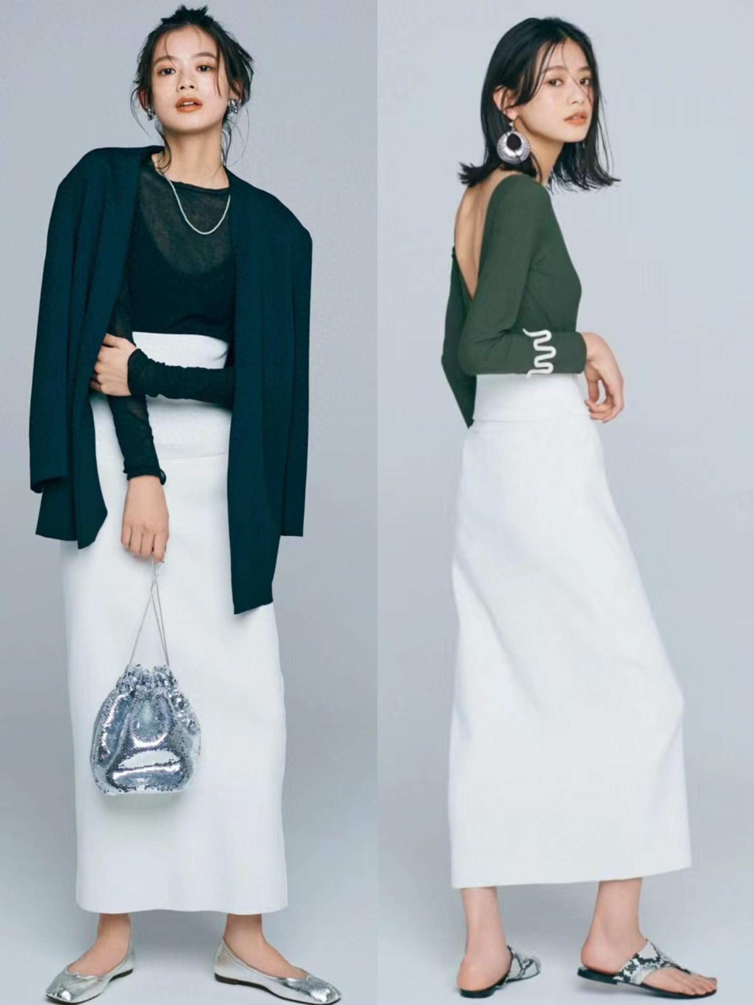 如果你不喜歡太過醒目的裝扮,但又不想讓自己的穿搭落於俗套。我們可以選擇直筒裙+平底鞋的組合,一種更加精緻考究的穿着方式,上班通勤穿也很合適。