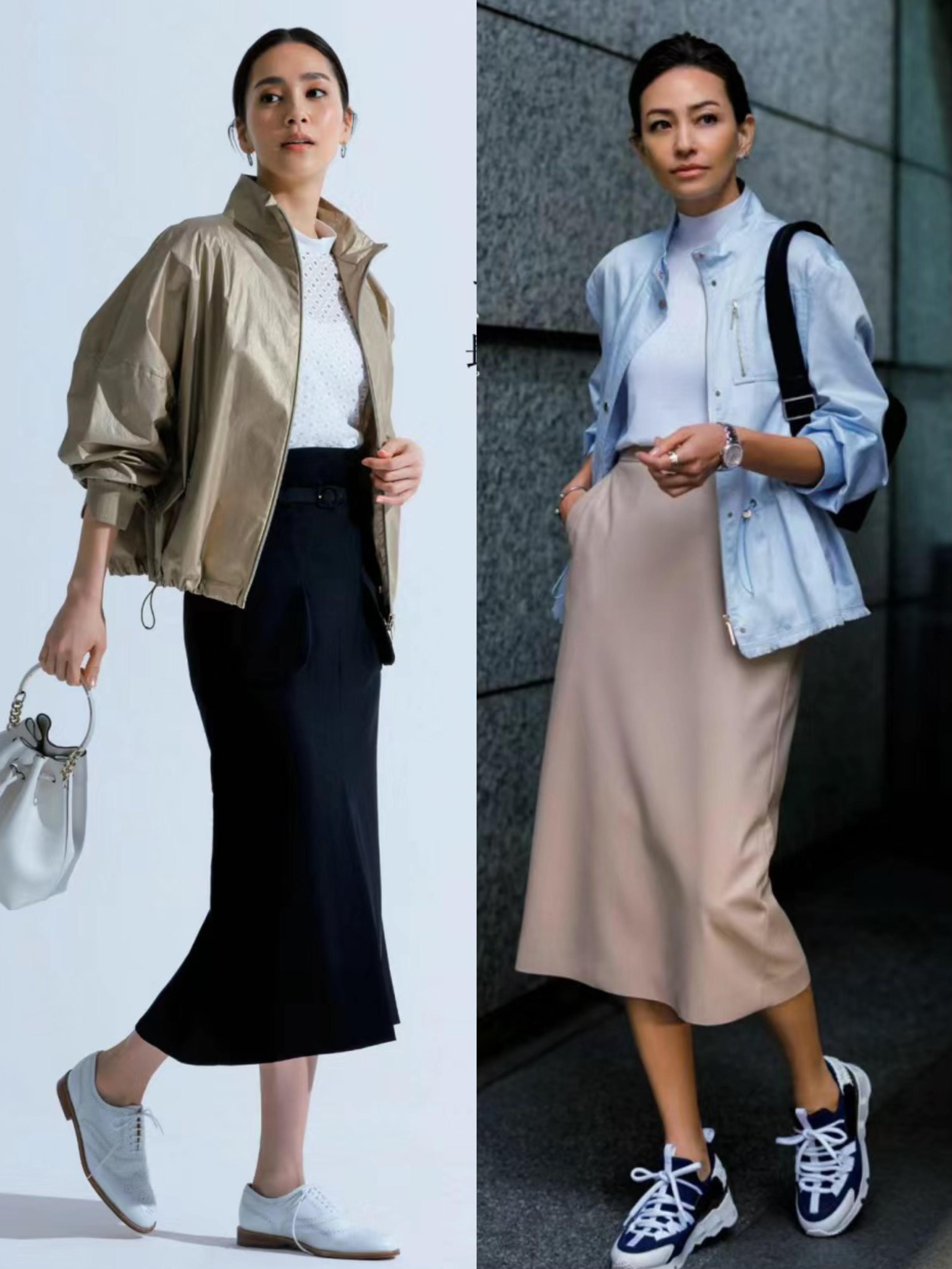當我們選擇用直筒半身裙來搭配平底運動鞋時,就具備了更加活潑、減齡的風格。春天裏的運動鞋,可以選擇相對清淺的色系,穿起來活潑清爽、弱化年齡感。