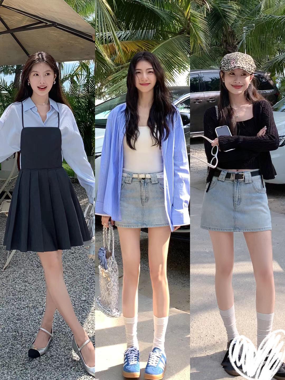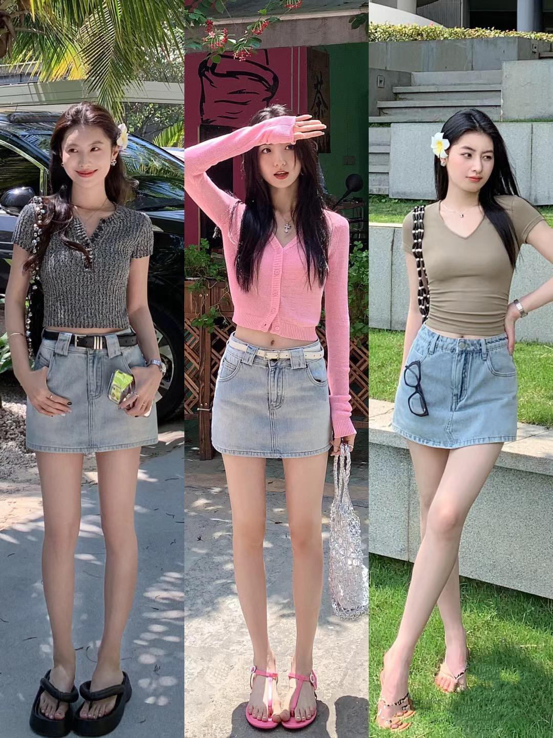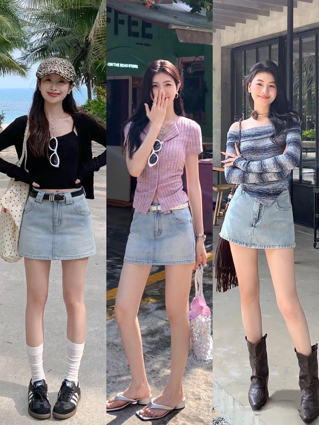 短款的針織衫,或者修身的T恤,都可以搭配高腰的半身裙。牛仔半身裙是一種高腰的款式,A字形的剪裁,對於雙腿線條具備了更強的修飾性,顯得比例感更優越。