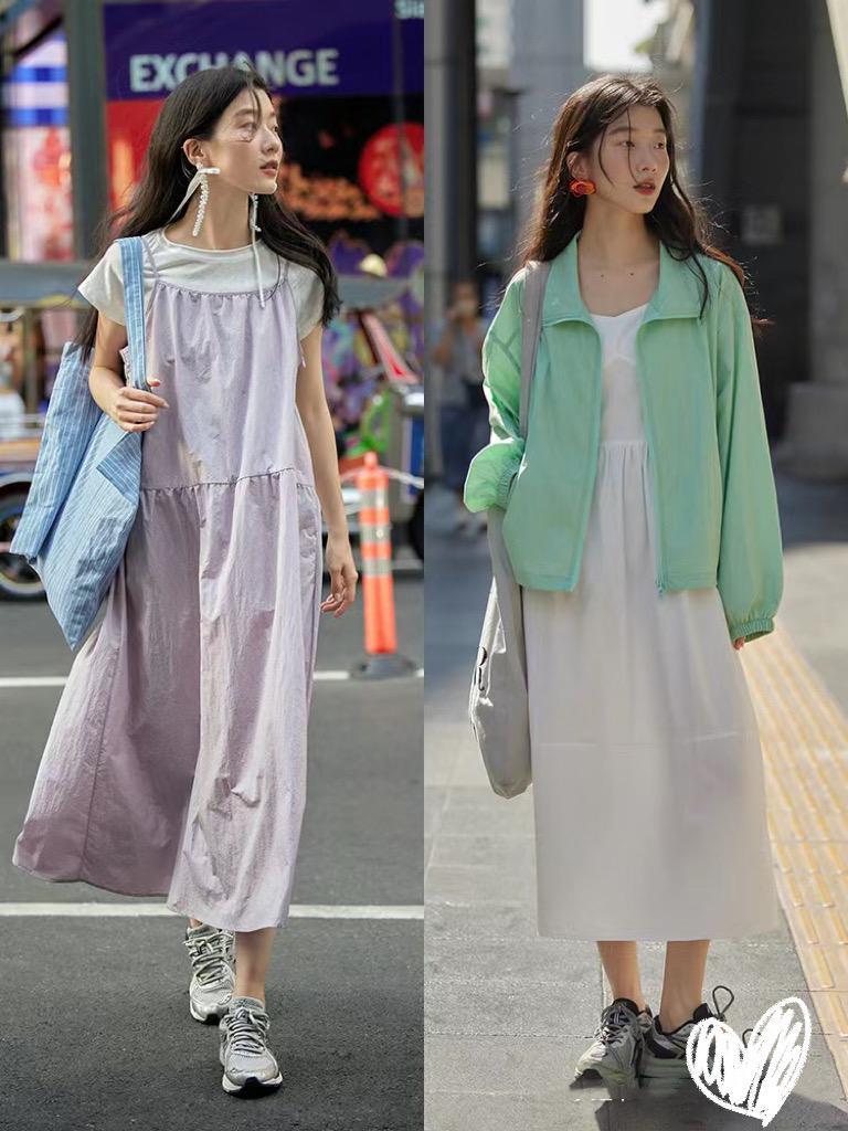 寬鬆的白色吊帶裙,或者淺紫色吊帶裙,我們都可以配T恤或者小外套來穿着。這種自在大方的穿衣方式,也擁有着更強的可塑性。