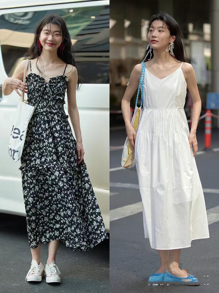 吊帶裙與平底鞋的組合,是一種更加輕便舒適的穿搭look。想要一種放鬆大方的美,我們可以嘗試這種吊帶裙+平底鞋的組合。
