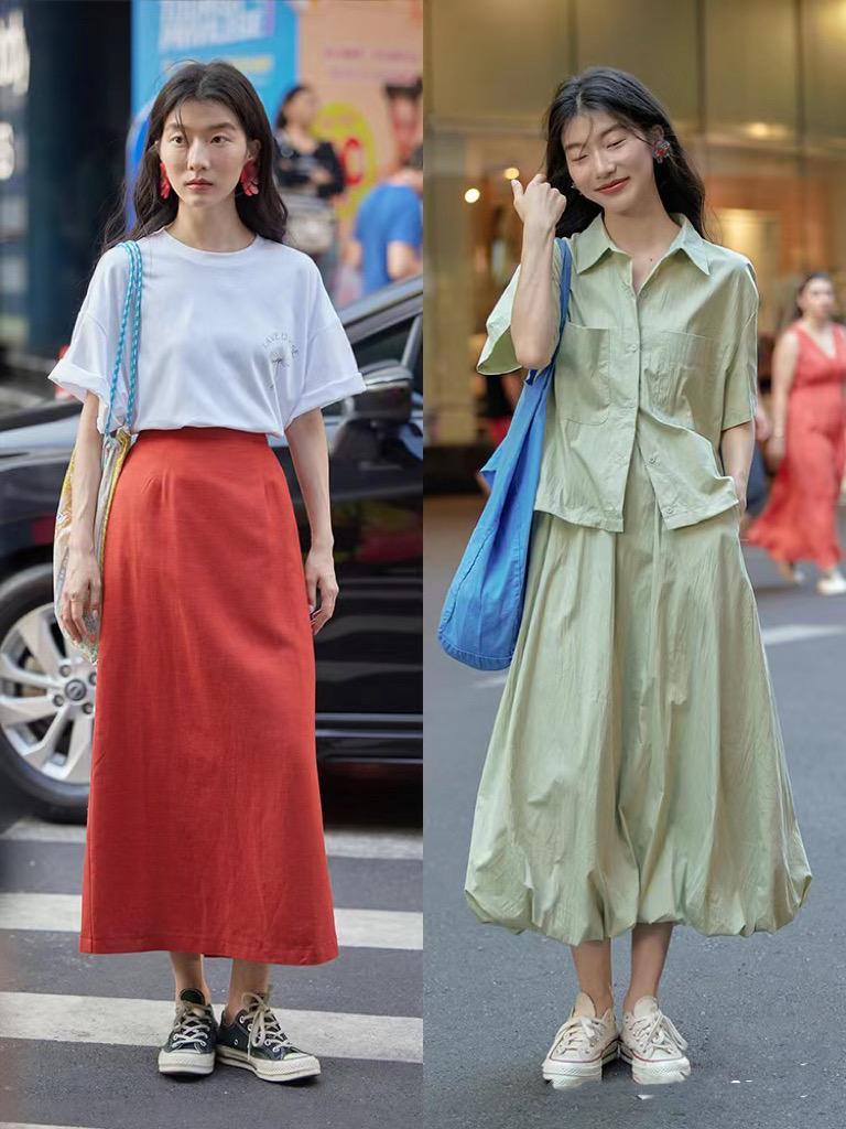 一雙帆布鞋,帶有青春的美好。像這種簡單又低調的穿搭,可以自然的弱化年齡感。不管是搭配吊帶裙,還是其他裙裝,都可以配平底的帆布鞋。