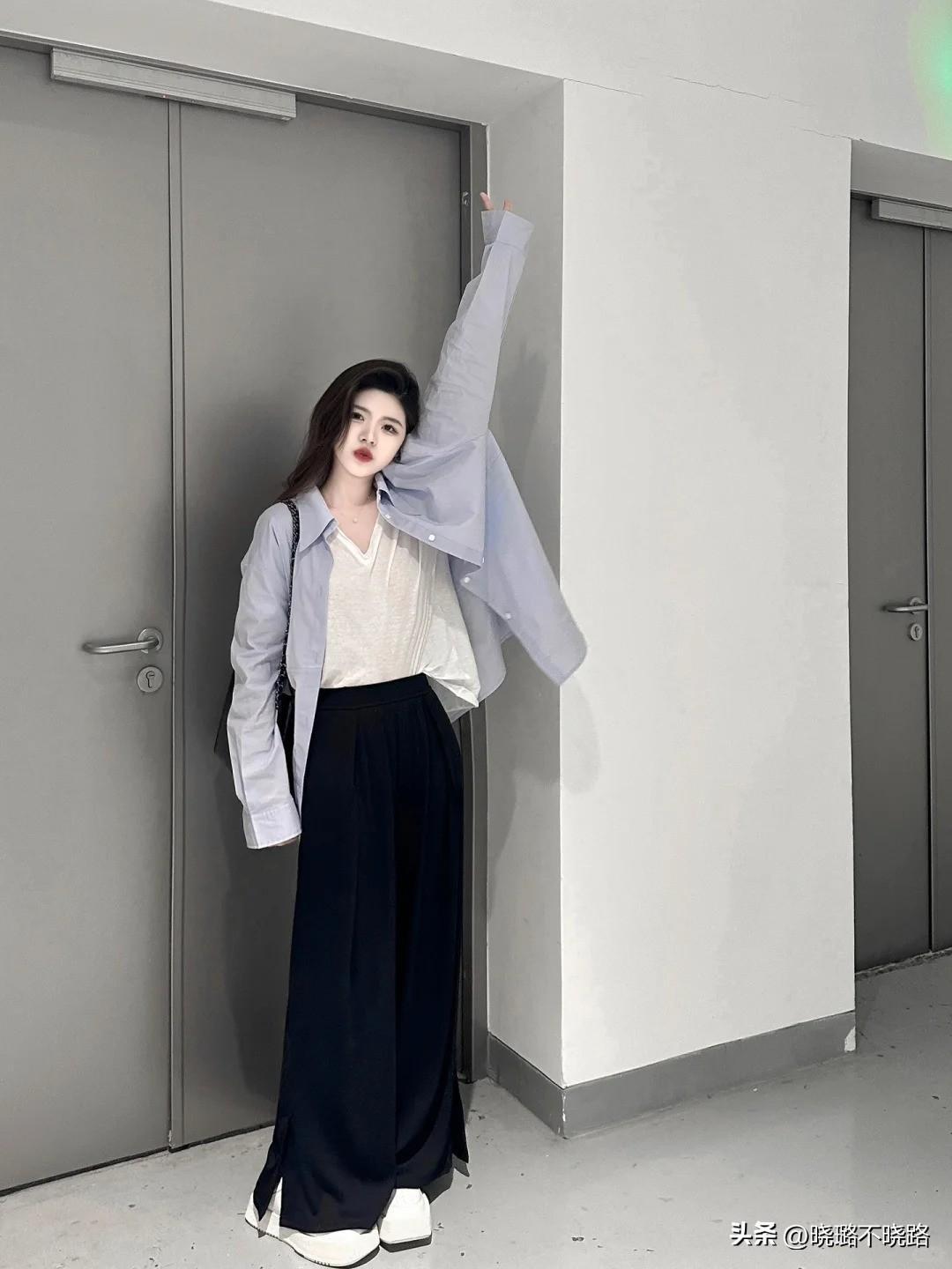 ·搭配組合:白色打底衫+灰色襯衫外套+直筒開叉闊腿褲