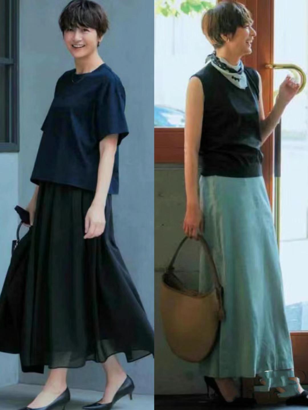 砍袖T恤+直筒半身裙