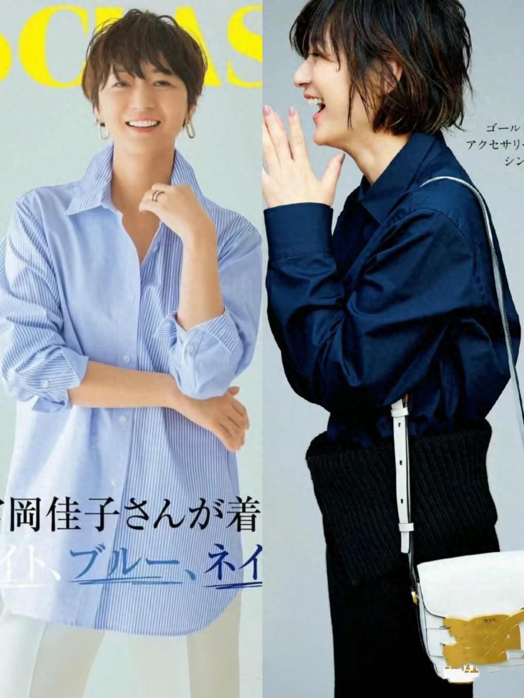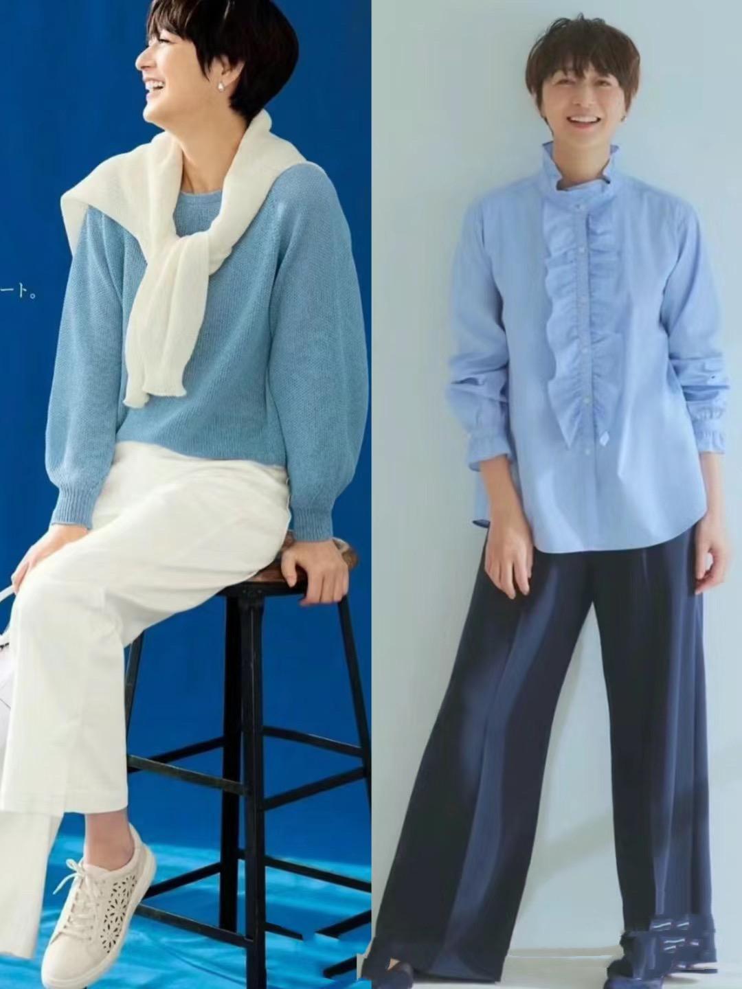 不得不說藍白配色清新又醒目,50+的女人穿起來會意外減齡。淺藍色針織衫,稍微寬鬆的版型,對於腹部、背部、肩部線條都具備了更強的包容性。
