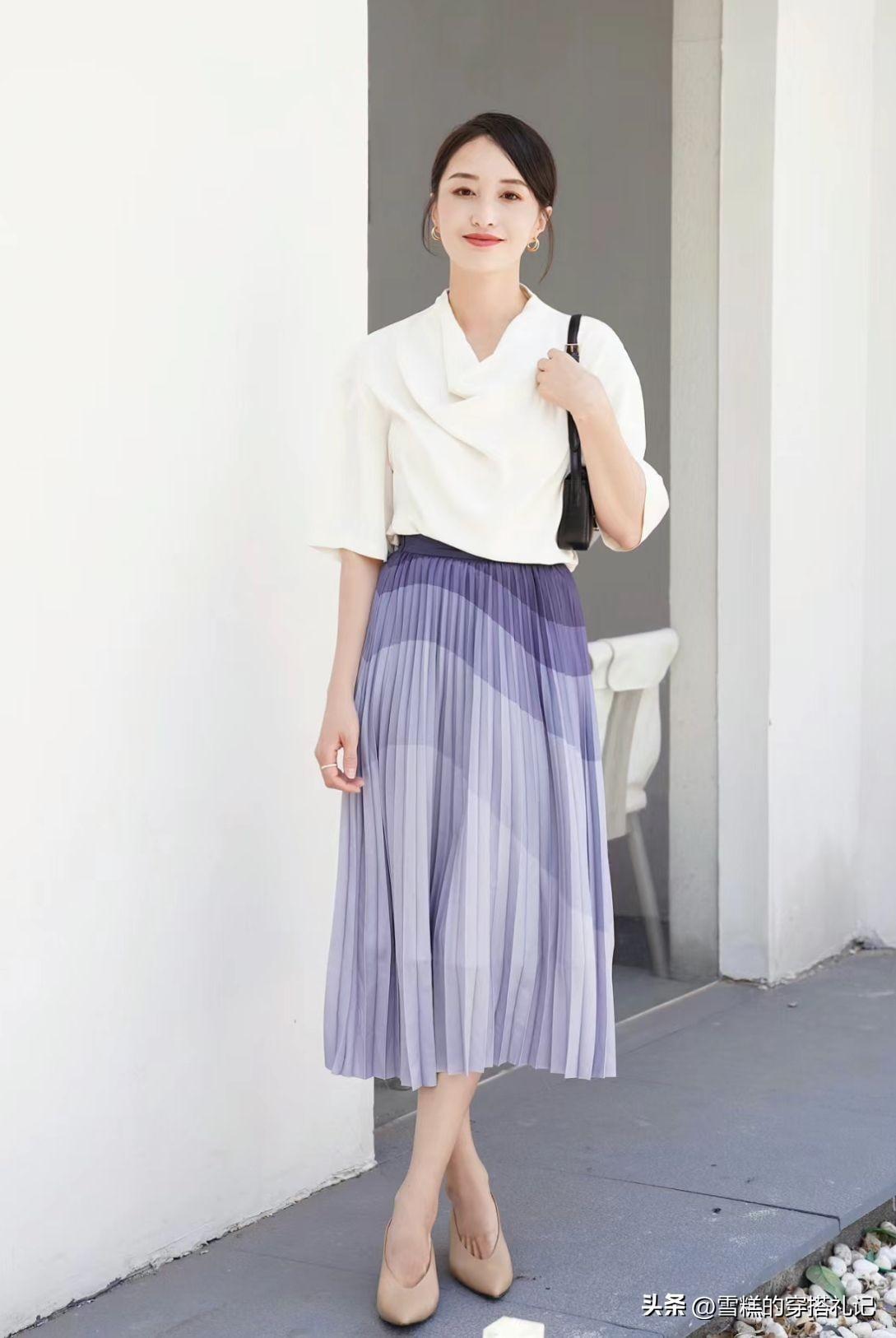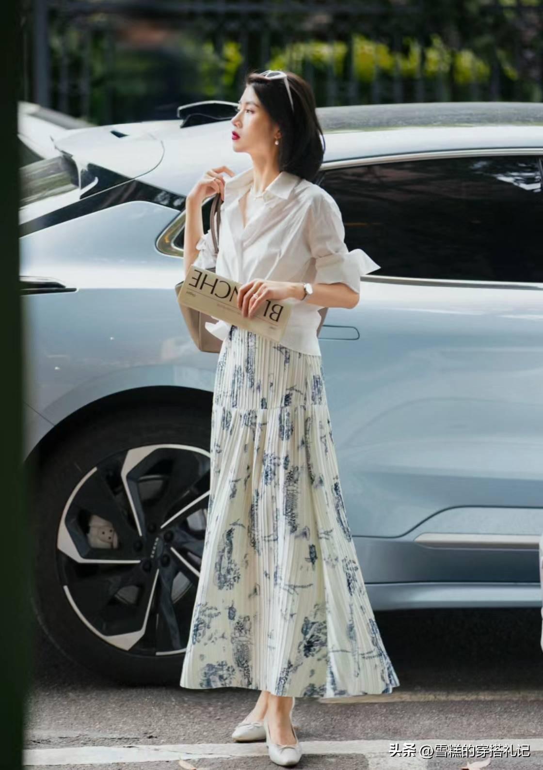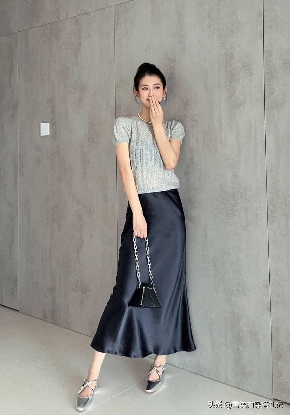 可是,換成色澤感十足的絲綢半身裙之後,瞬間就可以拉高造型的檔次,讓我們的穿搭時尚分更高一些,成功的“化腐朽爲神奇”。