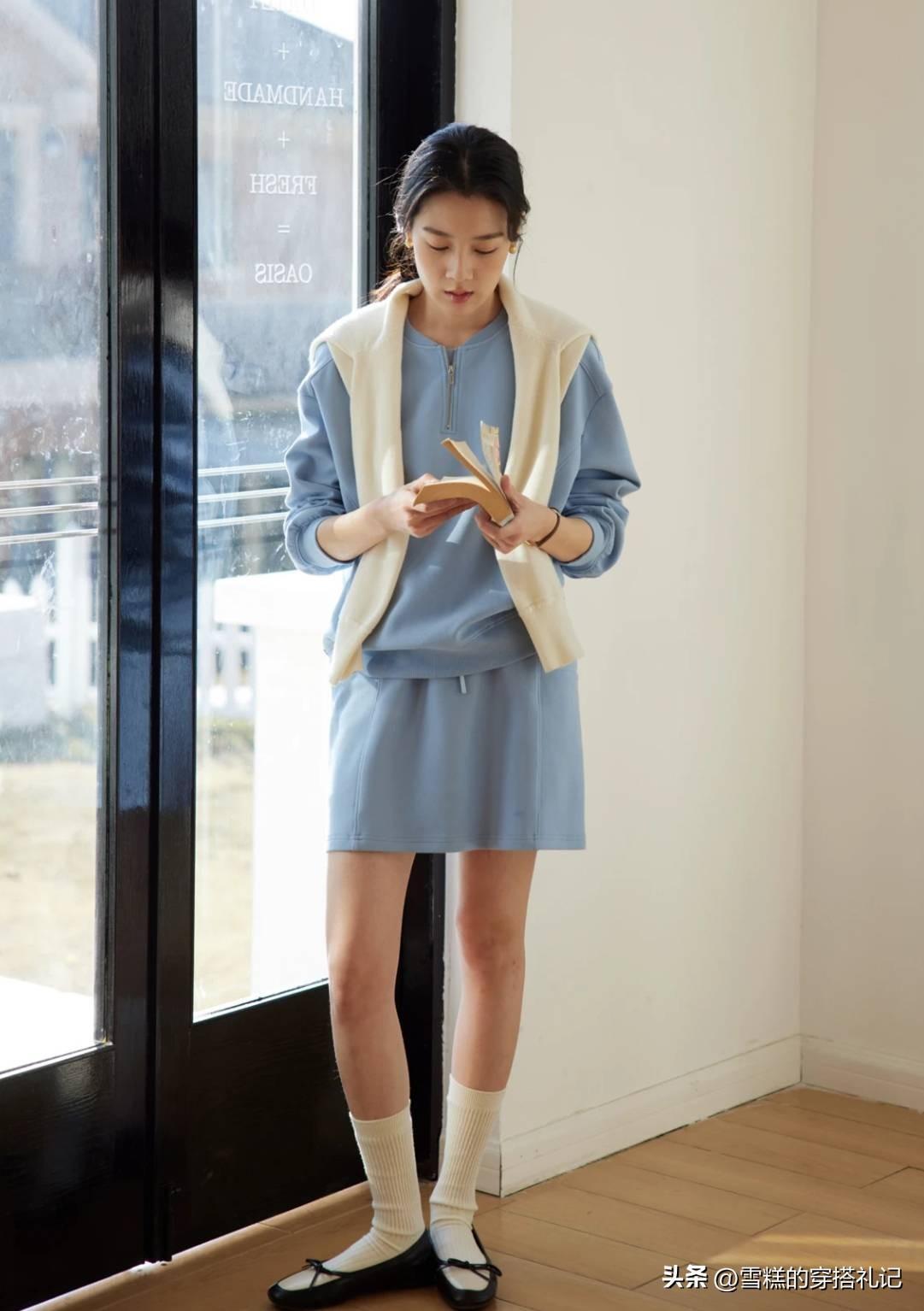 春天怎麼能少得了一些青春活力的顏色呢?天空的藍加上草地的綠,組合出來的效果就特別有生命力。天藍色的基礎款衛衣,疊穿一件淺綠色的襯衫,不僅顯白還特別有少女感。