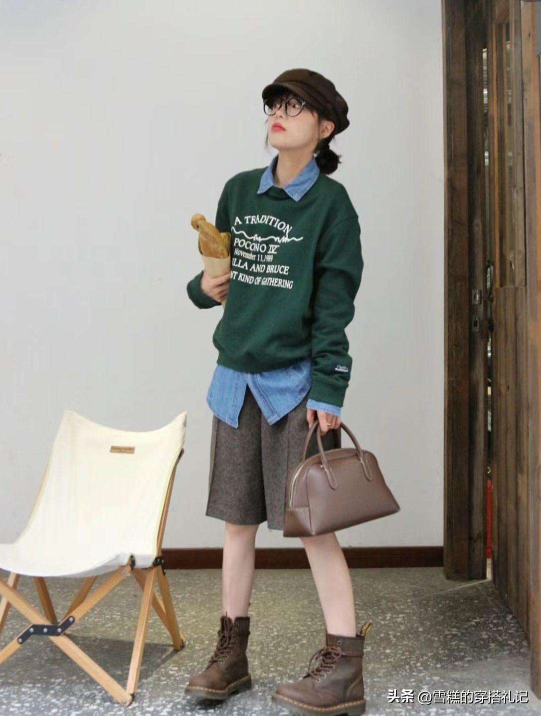 小個子一定不要錯過短款的衛衣,這一款綠色的短款衛衣,衣襬處通過收緊設計,又能很好的突出腰線,在裏面疊穿一件遮臀長度的白T恤,輕鬆隱藏臀肥胯寬的問題。
