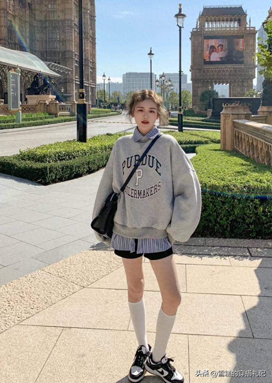 衛衣的長度則要根據身高而定,長度不過腰的短款衛衣,配高腰裙或者高腰褲,更顯腿長;長度遮臀的衛衣,應當配短褲短裙,營造“下身失蹤”的效果。