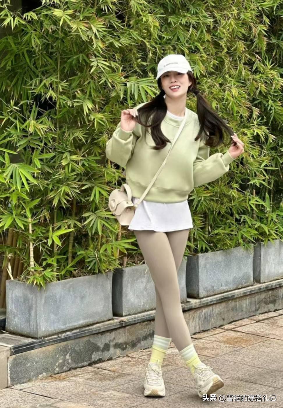 綠色衛衣和同色系的瑜伽褲進行組合,再通過短襪進行過渡,最後踩上一雙厚底運動鞋,顯高效果十足!