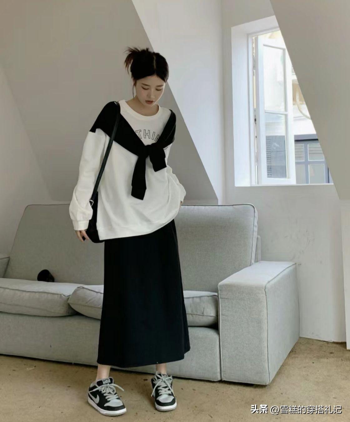 簡約款的遮臀白色衛衣,疊穿黑色披肩經典又不失時尚感,爲了縱向的延長身形線條,下裝選擇一條黑色的A字裙,和披肩形成呼應,還能穿出顯腿長的效果。
