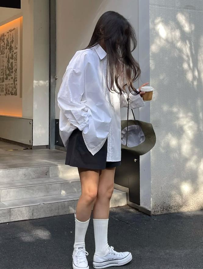 而對於在職場上班的姐妹們,則可以選擇一件剪裁合身的長款襯衫,或者是薄款針織衫,下裝再配一條高腰短裙子或西裝短褲,通過提高腰線比例,展現出幹練又不失氣質感。