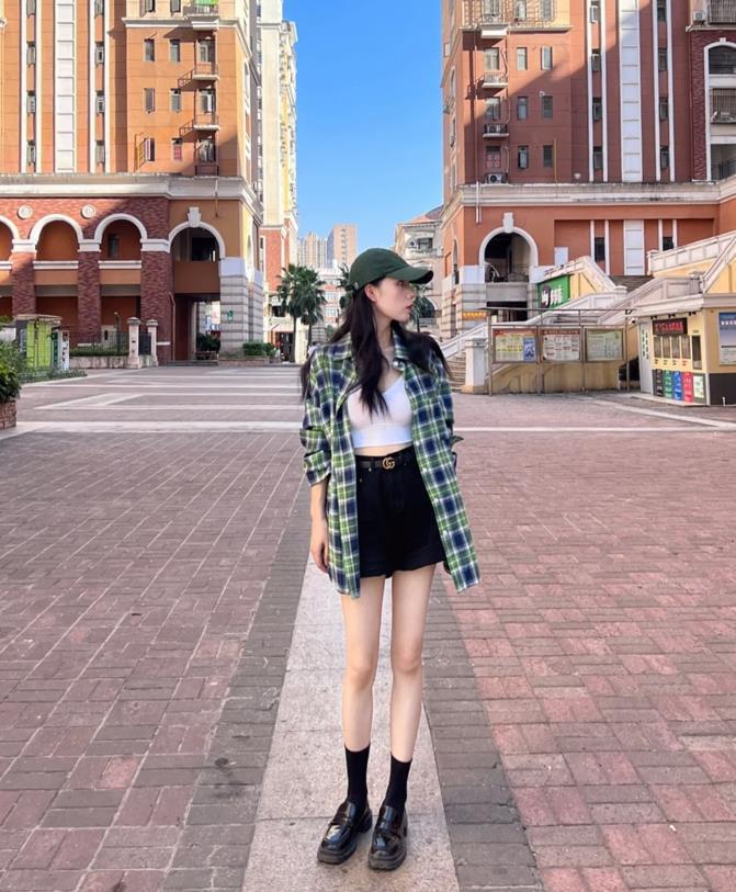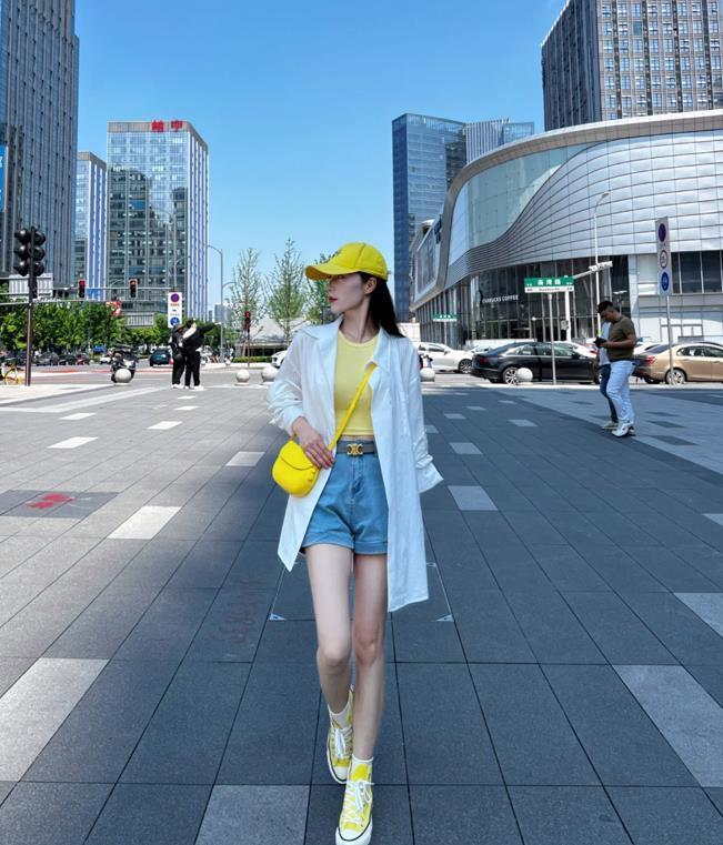 關於下裝的單品選擇,我們可以選擇短褲或者短裙子,長度儘量在膝蓋以上,這樣纔可以很好凸顯出下身的優勢,從而展現出腿部線條的優美感。