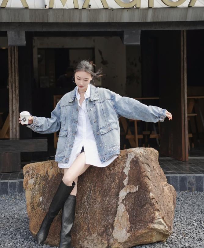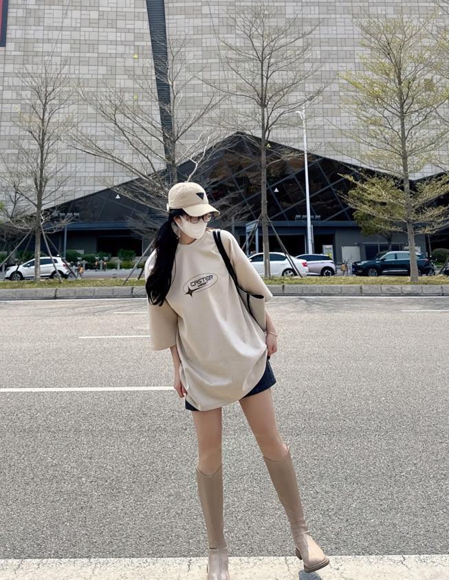 小個子女生,腿部比例又好的姐妹,說什麼也要試試上長下短的組合,實在是太顯腿長了,輕鬆打造出高挑感。喜歡這種長款寬鬆版型的t恤,搭配半身短裙,加上一雙長筒靴,冪式下身失蹤法就get起來了。