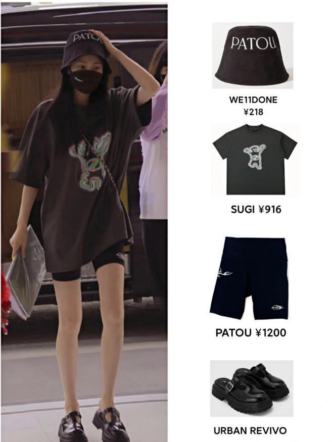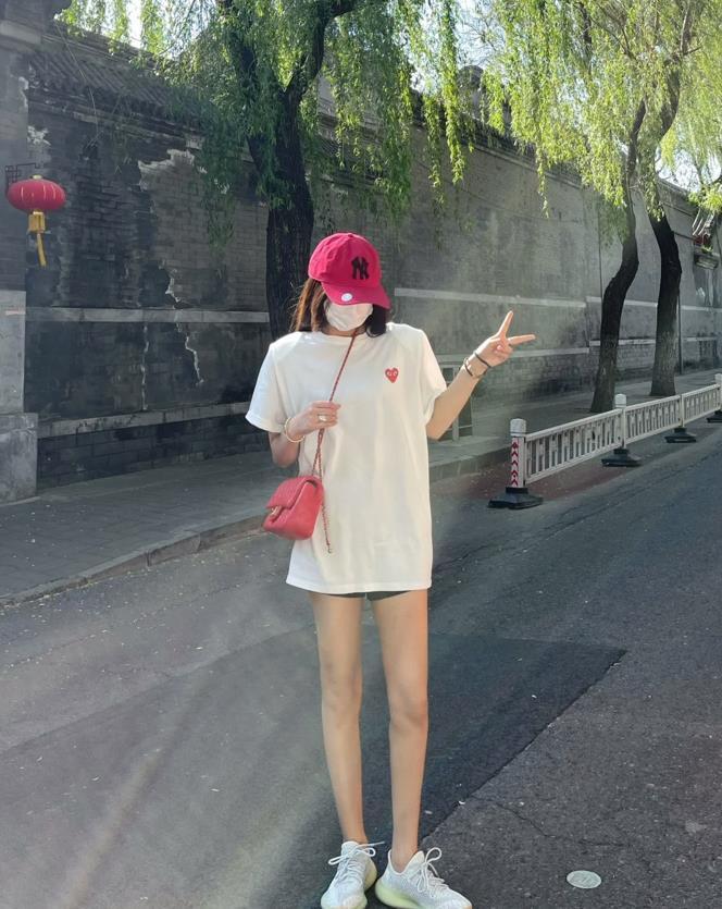 白鹿膚白貌美大長腿,真的很適合這種上長下短的搭配,寬鬆的長款短袖t恤,像這種版型,對身材包容性是極佳的,色調是深色,視覺上更顯瘦。搭配緊身騎行短褲,一鬆一緊,很顯層次感。