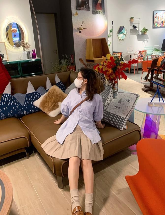 很適合小個子女生的一套穿搭,這麼穿舒服又不失少女範,逛街約會毫無壓力,淡藍色的襯衫+奶茶色百褶半裙,利用米色襪子外露,製造出層次感。加上一雙棕色樂福鞋來配,又多了幾分復古的氣息。