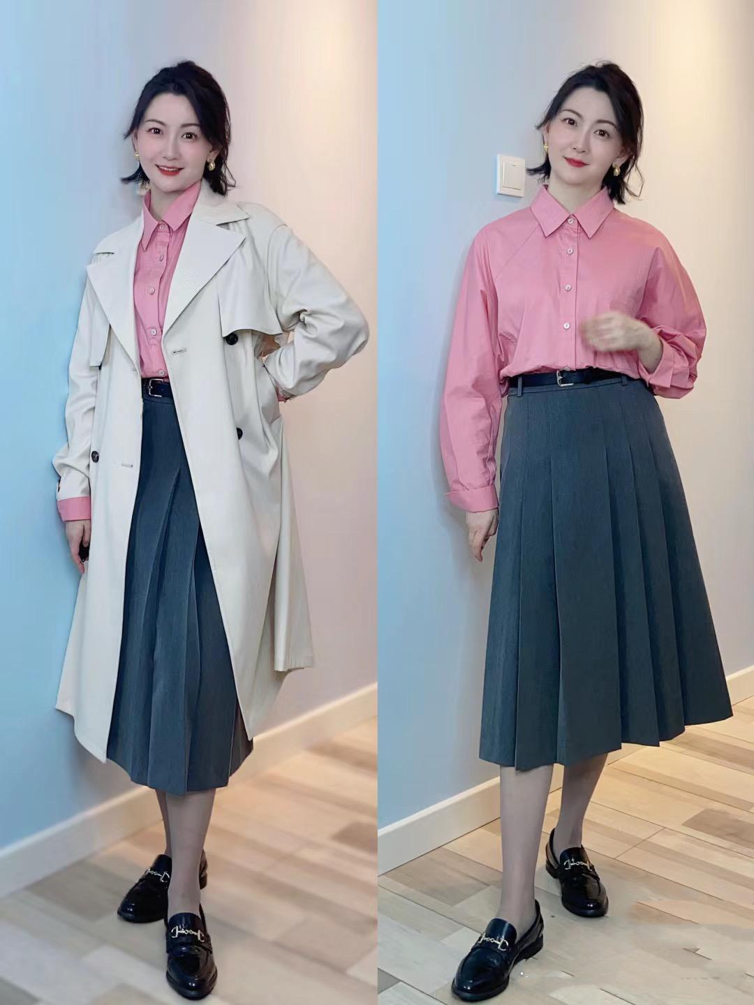 精準定位也是揚長避短的關鍵,像這種寬鬆的粉色襯衫,可以搭配高腰的百褶裙、清爽利落又很大方。像這種粉色襯衫,配上立體的百褶裙,更自然的包容下肢厚重。