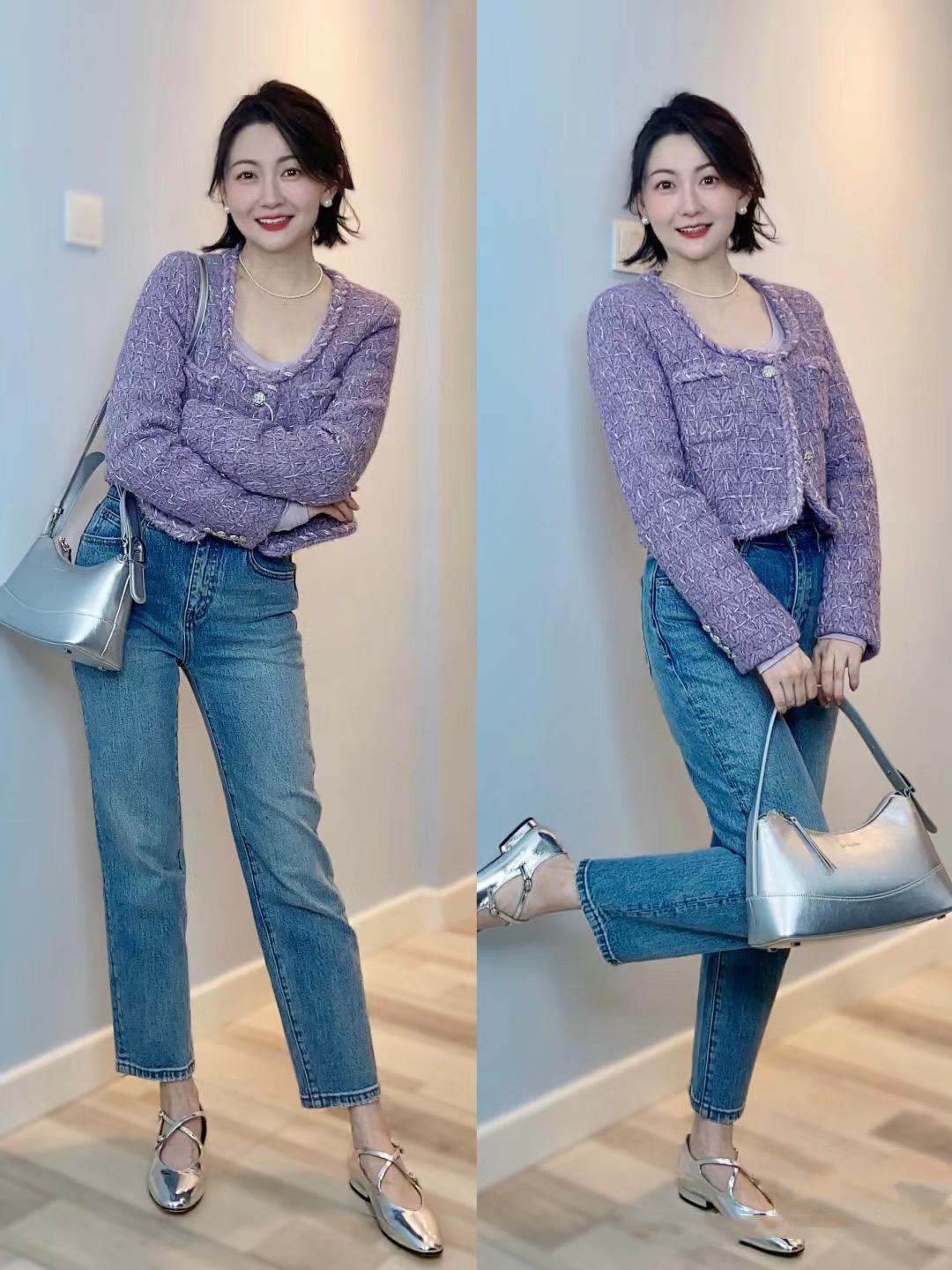 像這種小香風外套,配直筒的牛仔褲,對於雙腿的修飾效果也不錯。直筒牛仔褲搭配九分褲的設計,可以把腳踝線條修飾的更加纖細修長,給人一種很輕盈大氣的美。