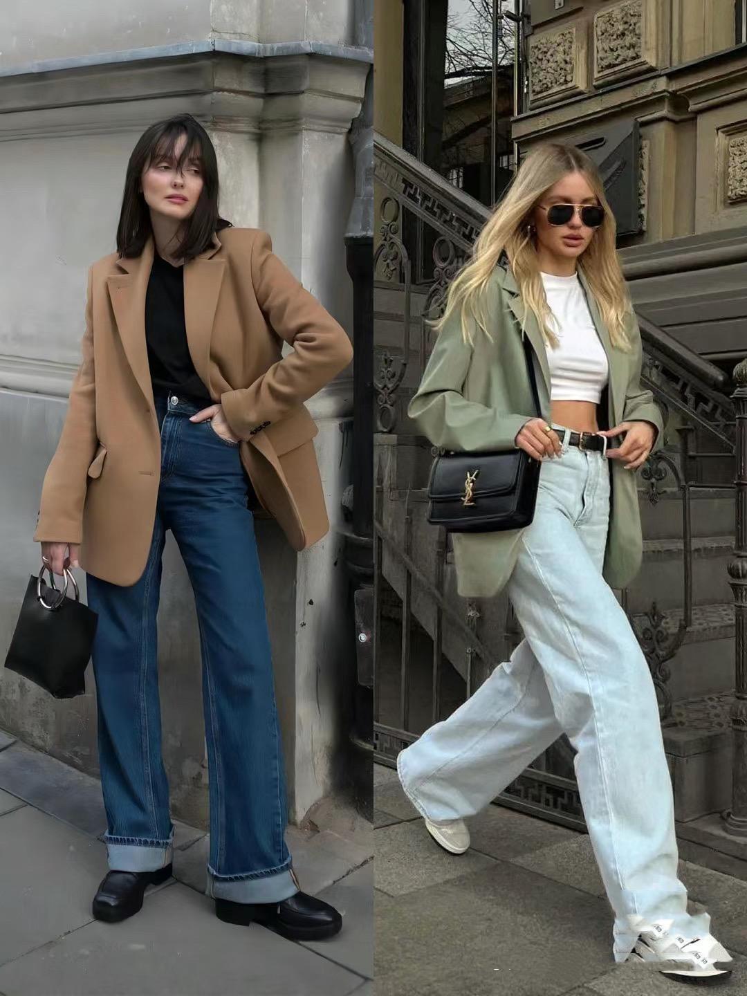 穿一件小廓形的西服外套,可搭配經典的深色系。用深色西服外套來搭配高腰的直筒牛仔褲,稍微露出腳踝位置就輕盈曼妙,這種搭配方式也格外的醒目。