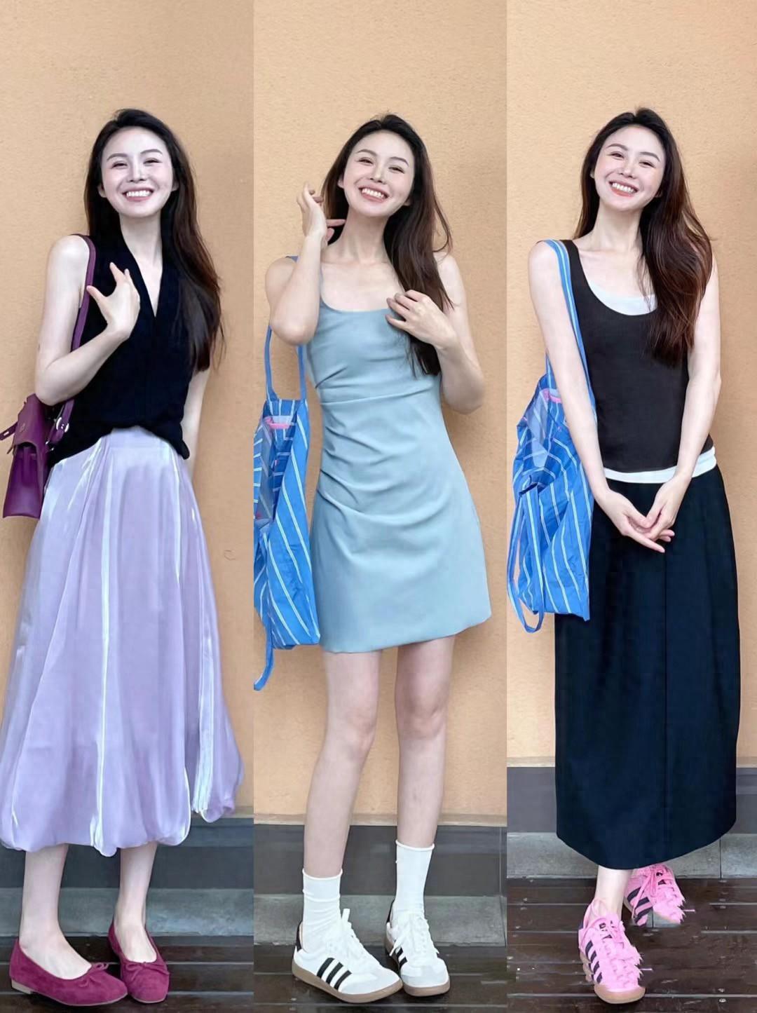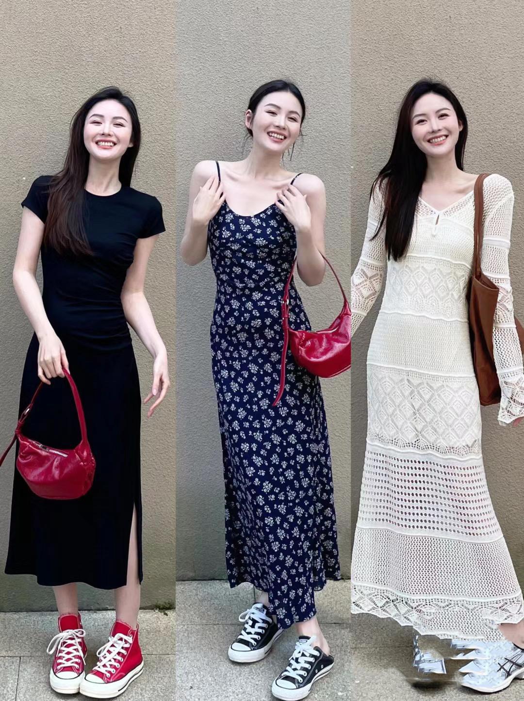 誰說穿吊帶裙就一定要配高跟鞋呢?如果喜歡鬆弛大方、優雅浪漫的美,我們也可以用白色板鞋來凹造型呀。