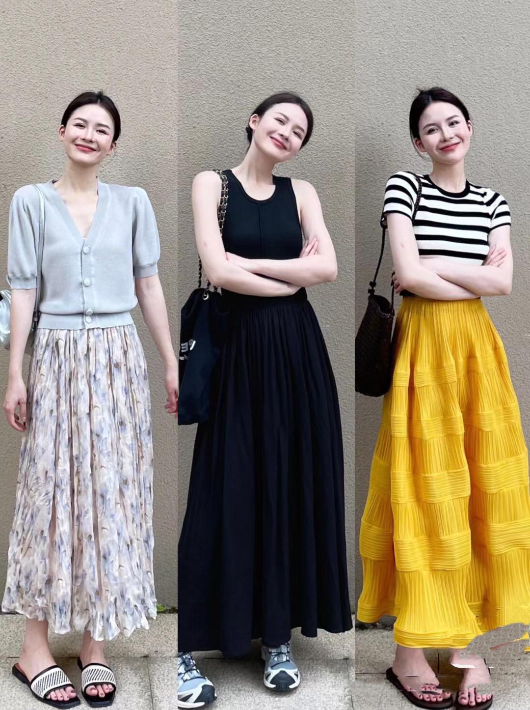過膝的半身裙,可以選擇相對明亮的顏色,也可以搭配清新的印花。半身裙大量感的裙襬,配上寬鬆的版型,有一種舒適慵懶的美,對於身材也具備了更強的包容性。