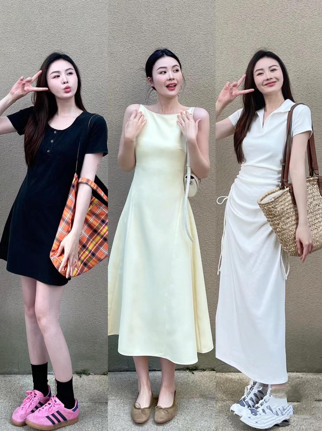 看似簡約的連衣裙,自然流暢的收腰設計,配米白色、或者鵝黃色的顏色。搭配稍微寬鬆的裙襬,就更多了幾分溫柔美,搭配運動鞋、或者單鞋都更有女人味。