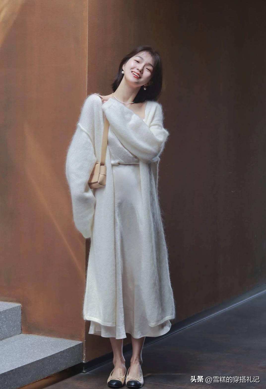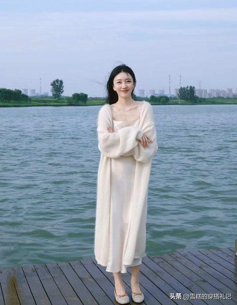 色調統一的前提下,要通過不同的面料去展現出層次感,就好比米白色的絲綢吊帶裙+長款針織開衫,雖然都是很柔軟的面料,但是表面的質感和光澤度,差別卻很大。